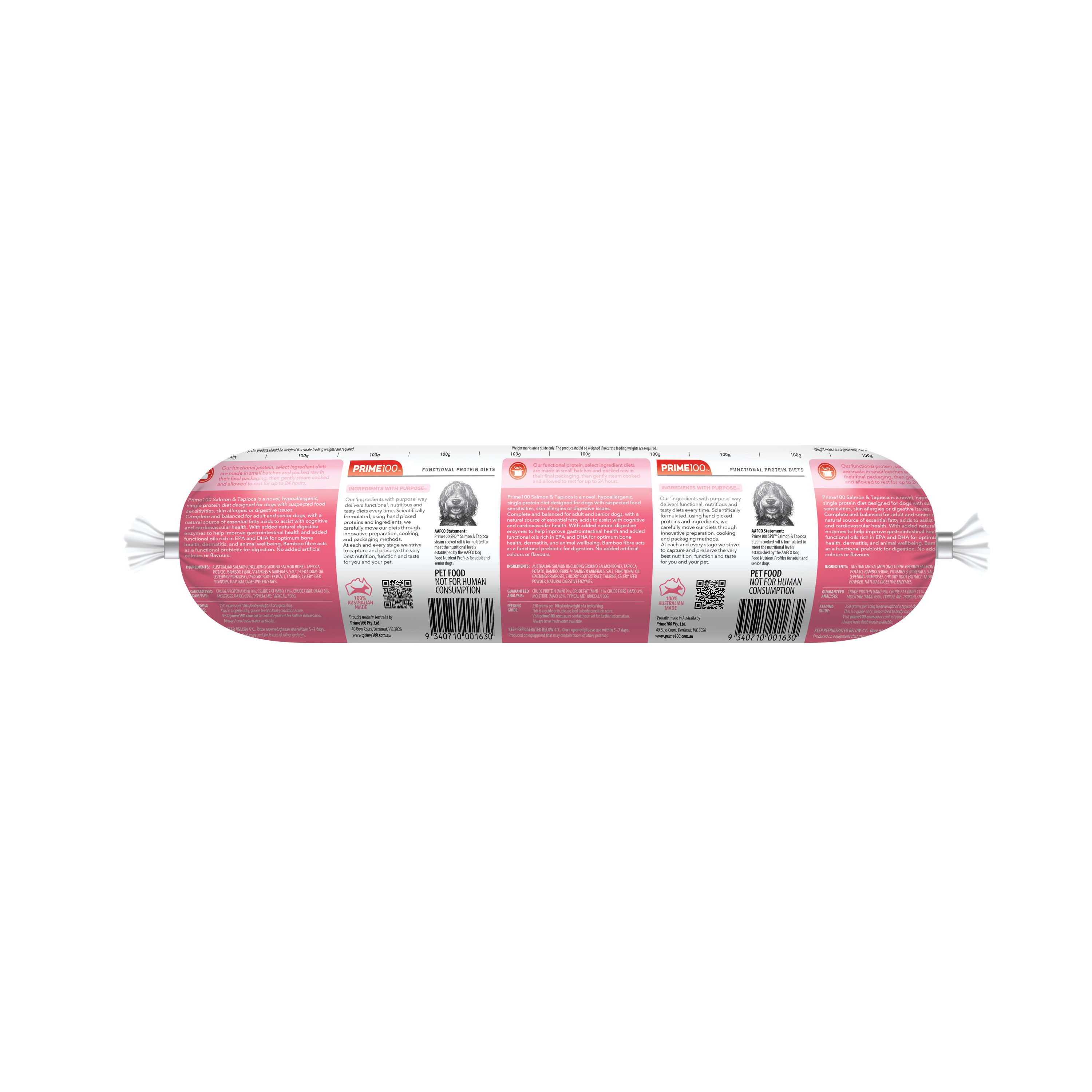 AAFCO Statement: Prime100 SPD Fresh Roll Salmon & Tapioca cooked roll is formulated to meet the nutritional levels established by the AAFCO Dog Food Nutrient Profiles for adult & senior dogs.