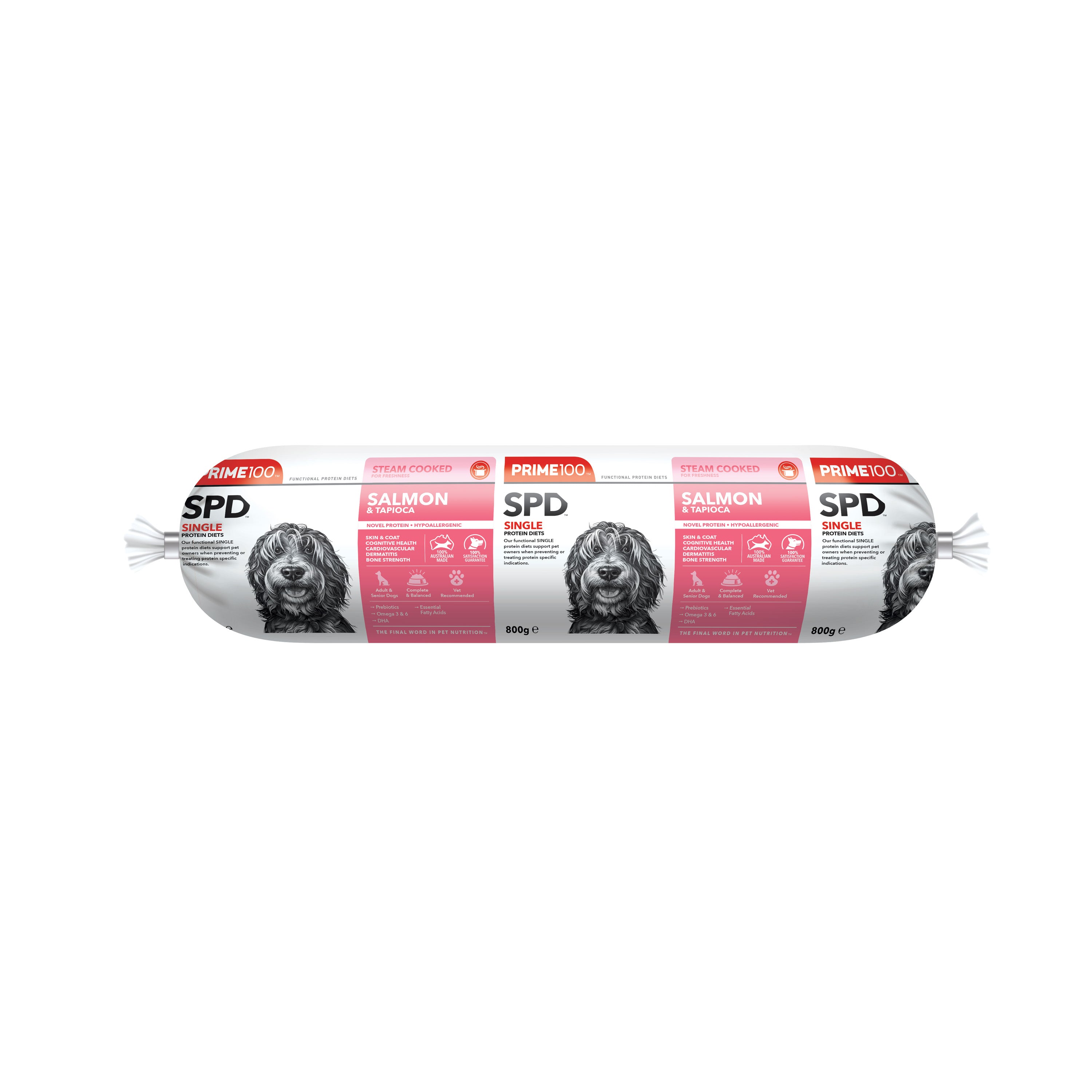 Prime100 SPD Fresh Roll Salmon & Tapioca is a novel, hypoallergenic, single protein diet designed for dogs with suspected food sensitivities, skin allergies or digestive issues. Complete and balanced for adult & senior dogs with a natural source of essential fatty acids to assist with cognitive and cardiovascular health. With added natural digestive enzymes to help improve gastrointestinal health and added functional oils rich in EPA and DHA for optimum bone health, dermatitis, and animal wellbeing. Bamboo fibre acts as a functional prebiotic for digestion. No added artificial colours or flavours.