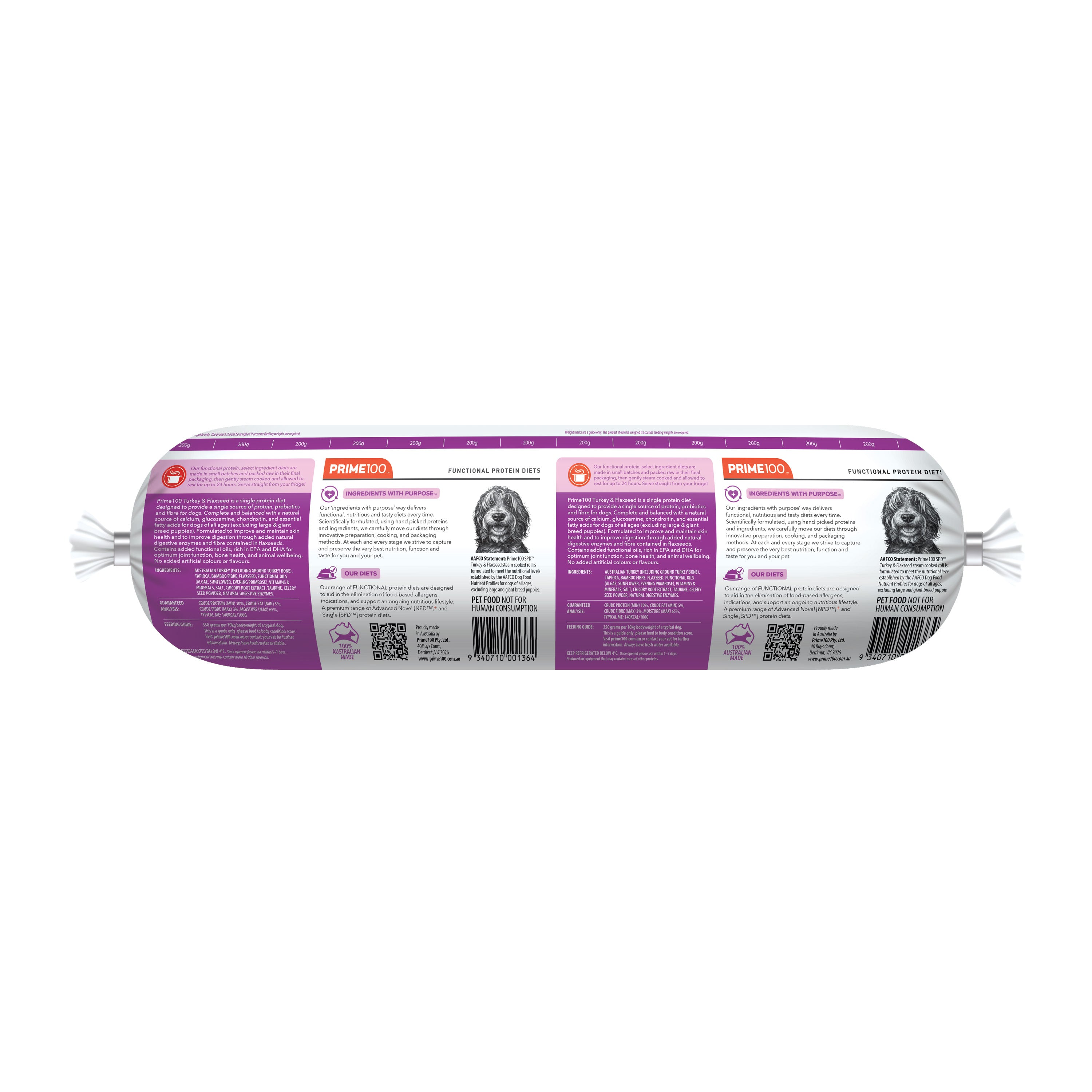 AAFCO Statement: Prime100 SPD Fresh Roll Turkey & Flaxseed steam cooked roll is formulated to meet the nutritional levels established by the AAFCO Dog Food Nutrient Proles for dogs of all ages, excluding large and giant breed puppies.