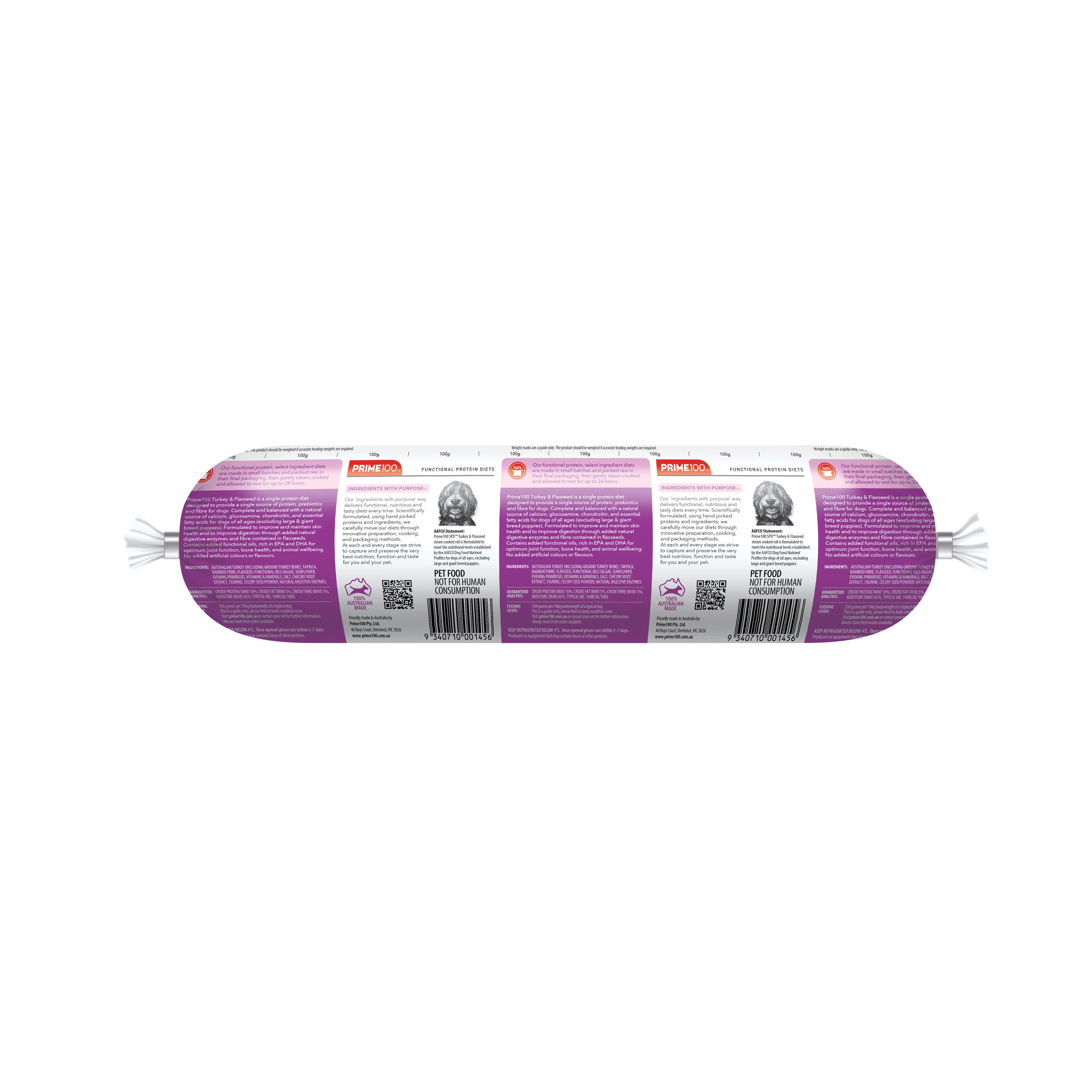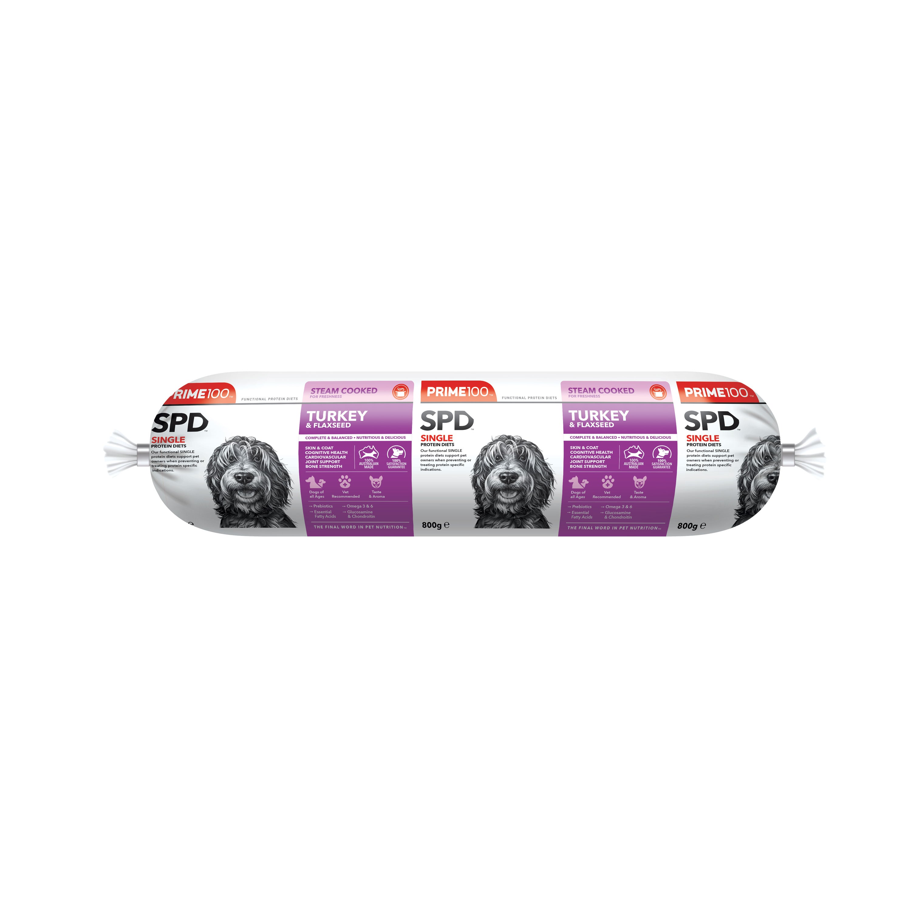 Online retailers / Find a storePrime100 SPD Fresh Roll Turkey & Flaxseed is a single protein diet designed to provide a single source of protein, prebiotics and fibre for dogs. Complete and balanced with a natural source of calcium, glucosamine, chondroitin, and essential fatty acids for dogs of all ages (excluding large & giant breed puppies). Formulated to improve and maintain skin health and to improve digestion through added natural digestive enzymes and fibre contained in flaxseeds. Contains added functional oils, rich in EPA and DHA for optimum joint function, bone health, and animal wellbeing. No added artificial colours or flavours.