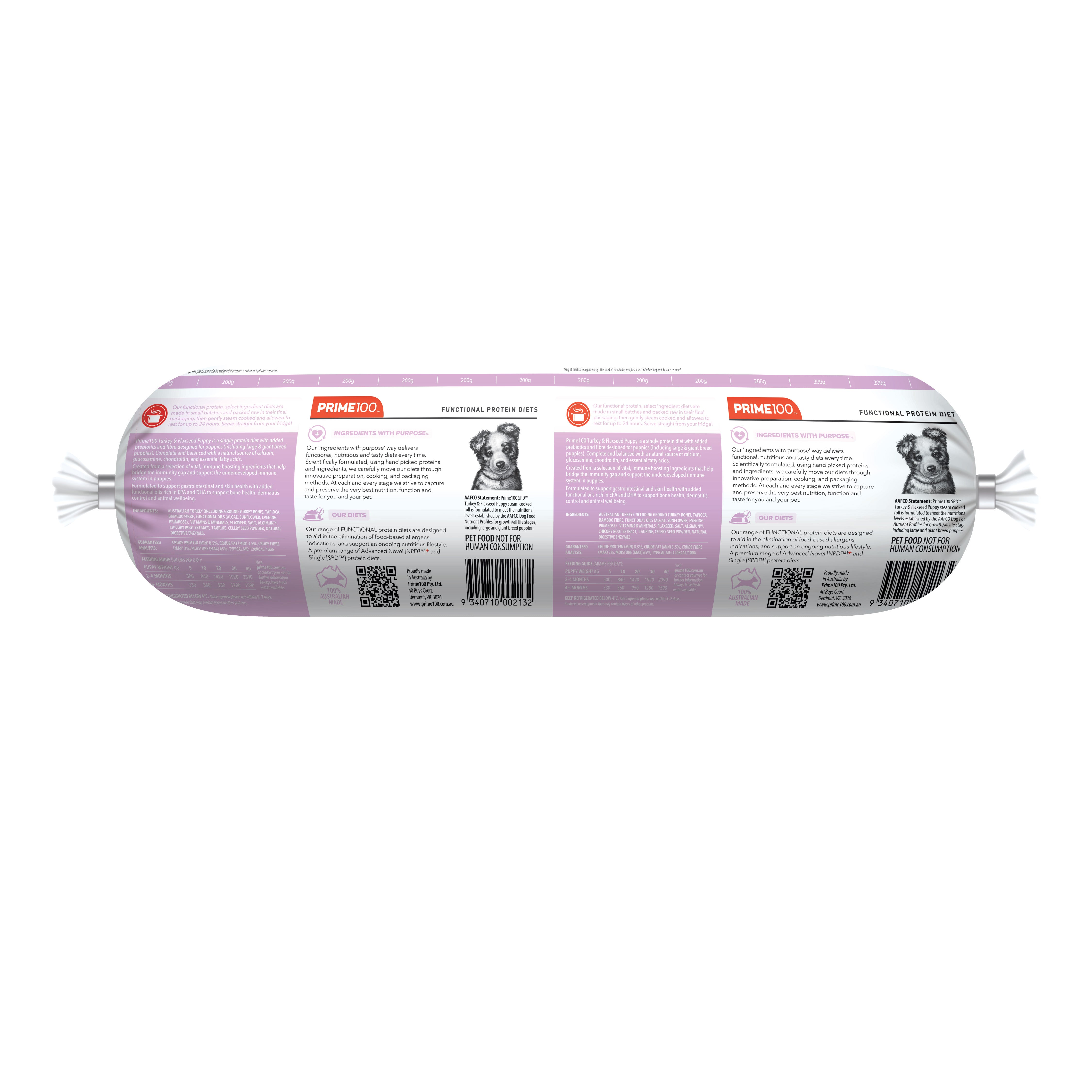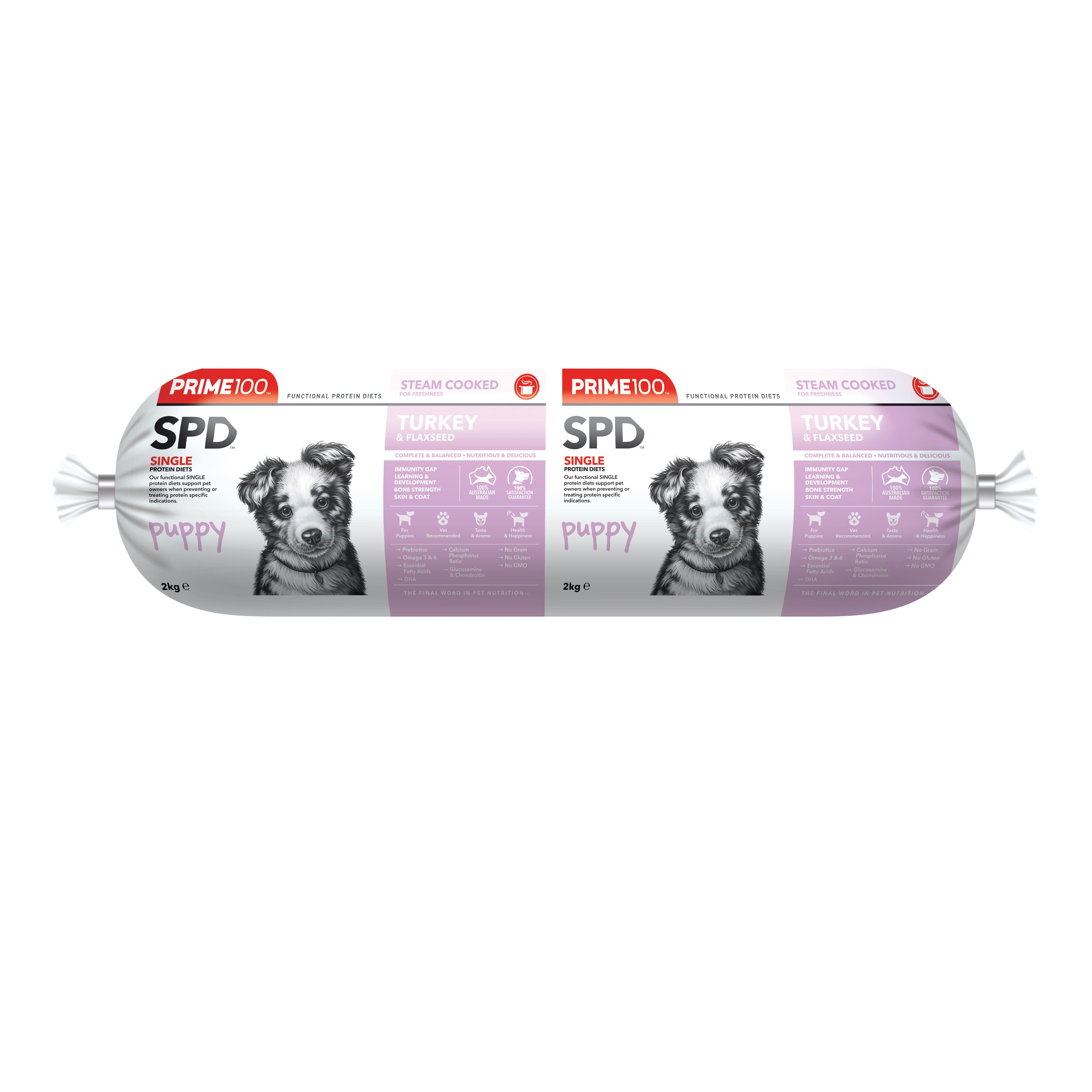 Prime100 SPD™ Turkey & Flaxseed Fresh Puppy Rolls are specifically formulated for growing puppies and may assist with suspected food sensitivities or skin allergies. Formulated with a protein to improve skin and coat health and help develop cognitive and immune function. Perfectly balanced with Omega 3’s and 6’s and added prebiotics.