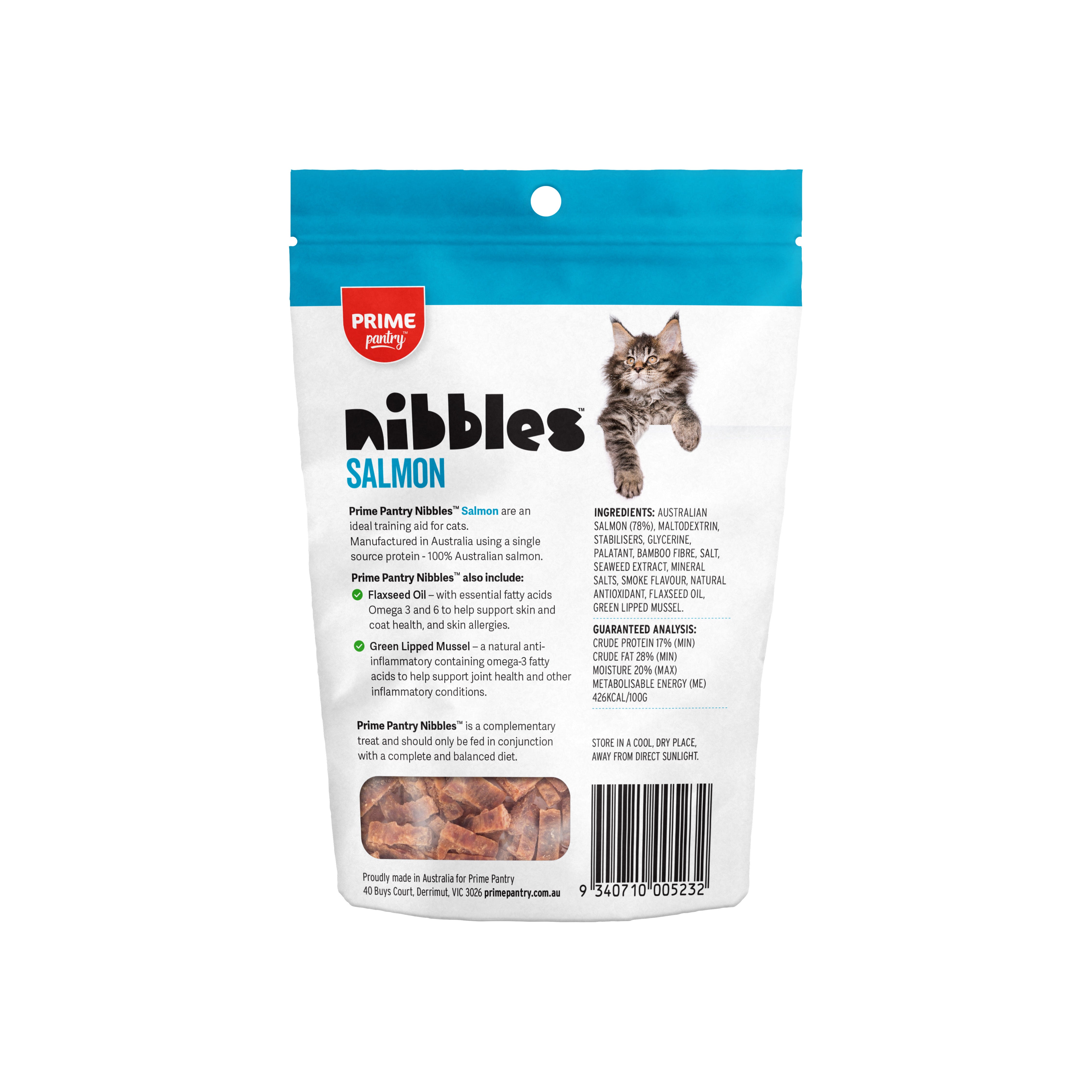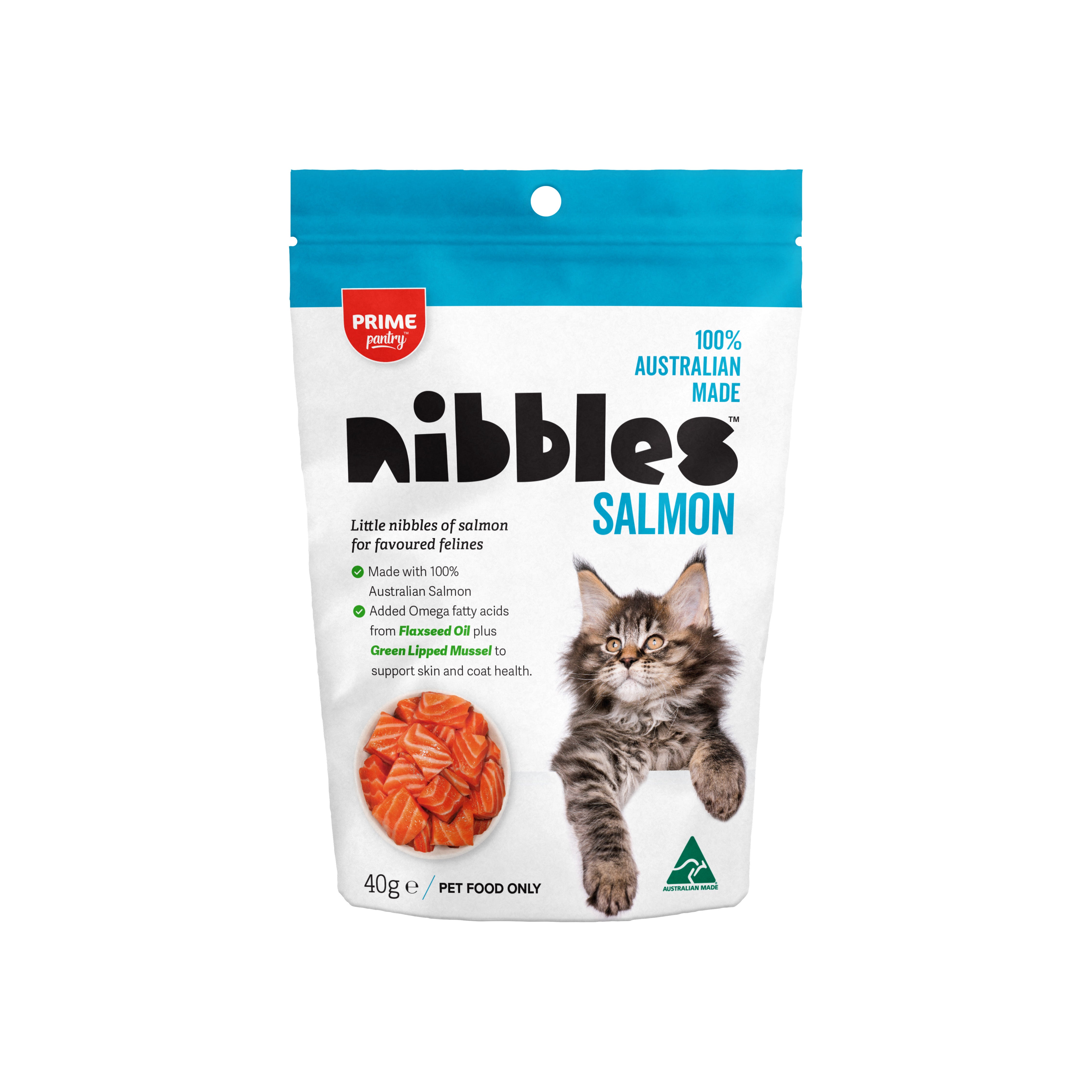Nibbles Salmon Cat Treat by Prime pantry, are an ideal training aid for cats. Manufactured in Australia using a single source protein – 100% Australian, human grade salmon.