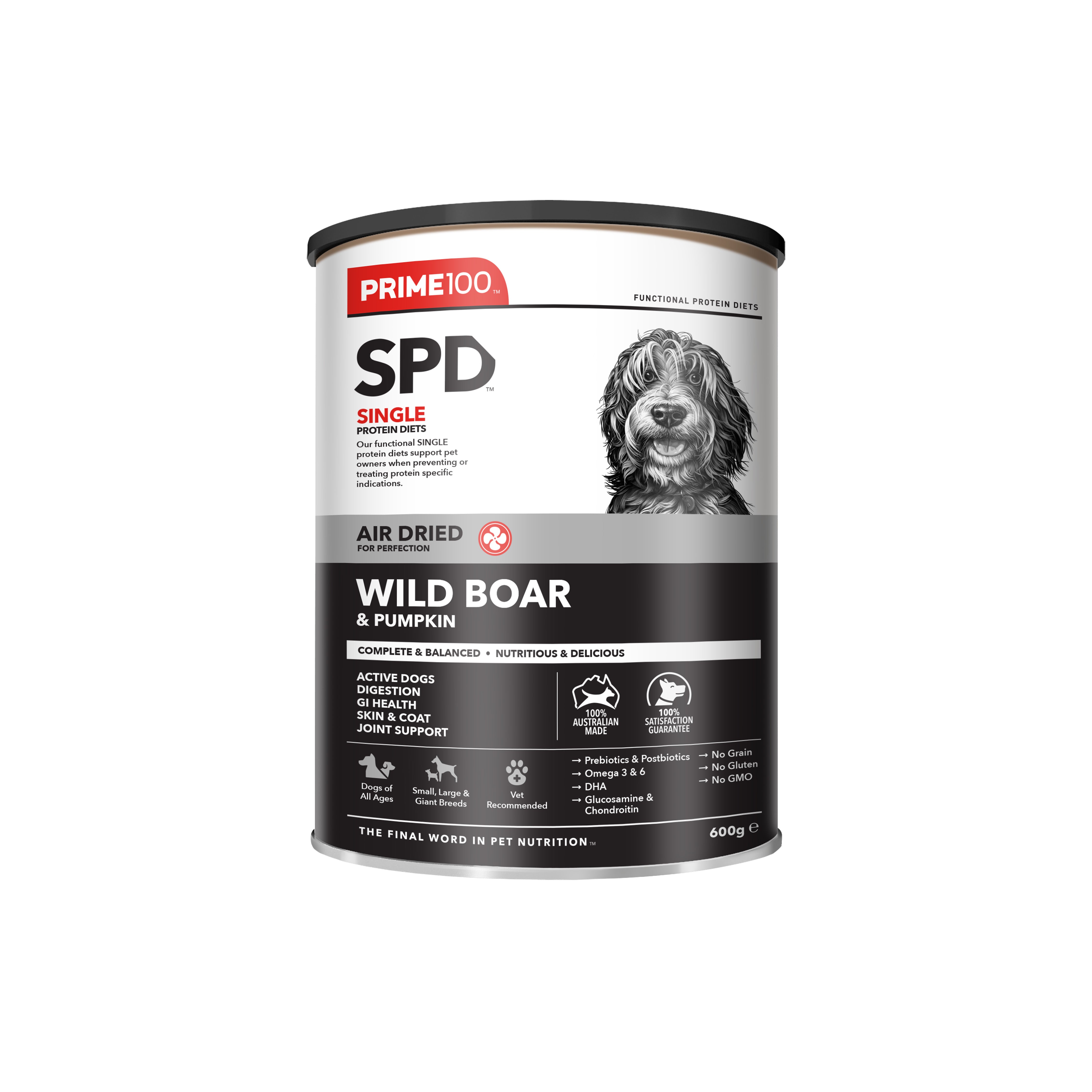 A recipe developed by science and crafted with fresh Australian ingredients. Prime100 SPD™ Air Dried Wild Boar & Pumpkin is gently air-dried to lock in essential nutrients, and for naturally enhanced palatability and aroma. A scientifically formulated, complete and balanced, single protein diet for dogs of all ages.