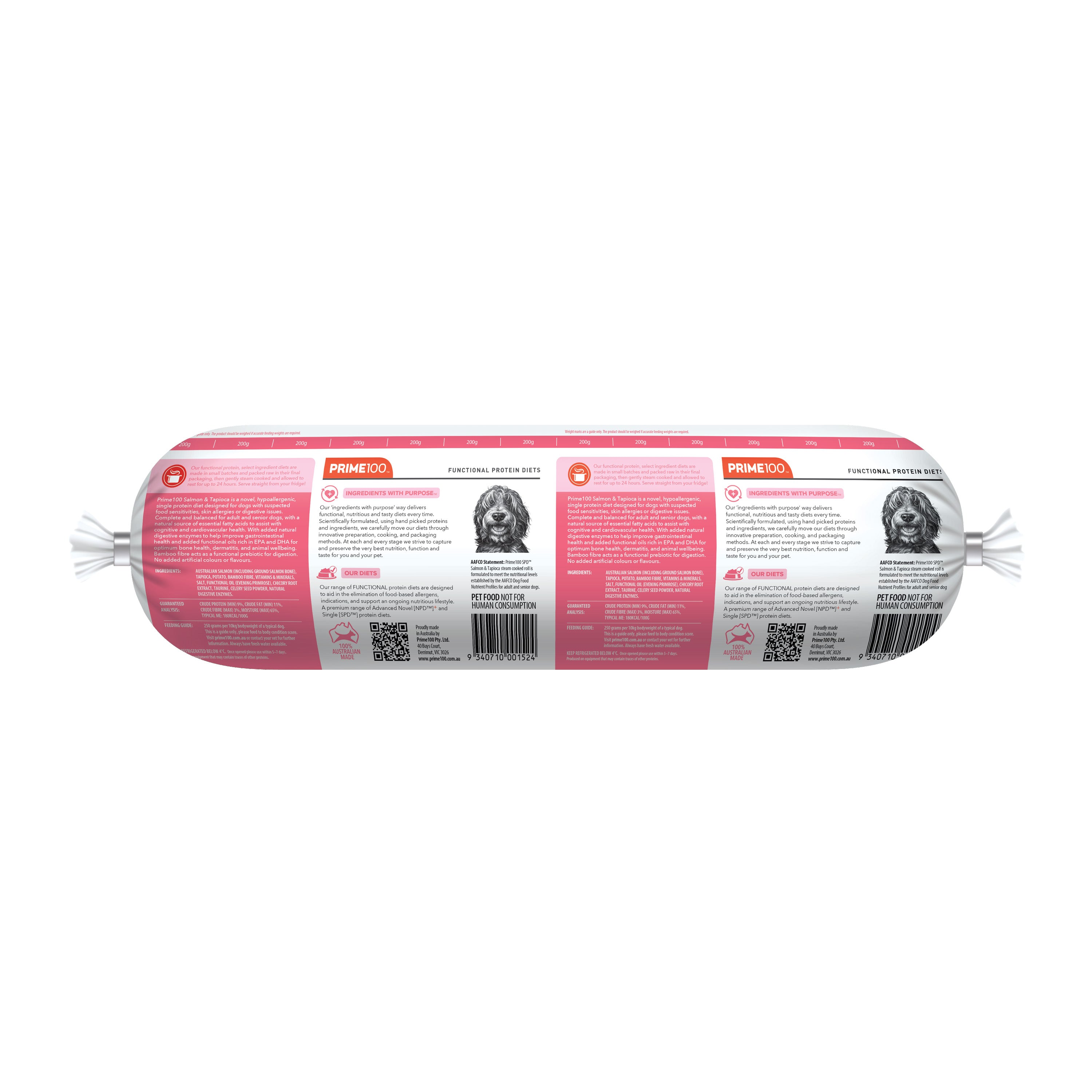 Online retailers / Find a storePrime100 SPD Fresh Roll Salmon & Tapioca is a novel, hypoallergenic, single protein diet designed for dogs with suspected food sensitivities, skin allergies or digestive issues. Complete and balanced for adult & senior dogs with a natural source of essential fatty acids to assist with cognitive and cardiovascular health. With added natural digestive enzymes to help improve gastrointestinal health and added functional oils rich in EPA and DHA for optimum bone health, dermatitis, and animal wellbeing. Bamboo fibre acts as a functional prebiotic for digestion. No added artificial colours or flavours.