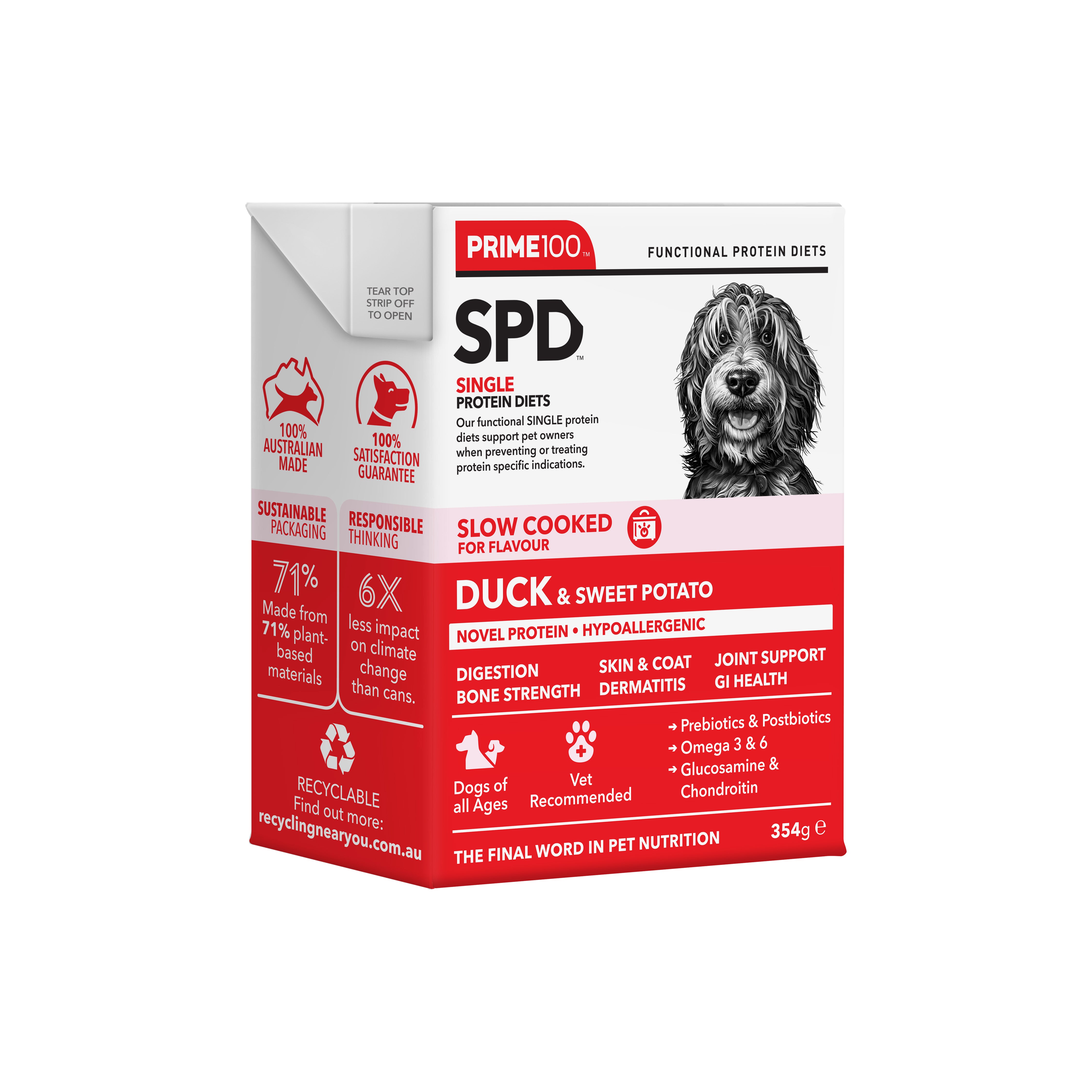 Store locatorPrime100 SPD™ Slow Cooked Duck & Sweet Potato is a novel, hypoallergenic, single protein diet designed to provide a novel source of protein and a rich source of fibre. Complete and balanced with a natural source of essential amino acids, fatty acids, glucosamine, chondroitin, for dogs of all ages. Plus a carefully balanced calcium phosphorous ratio essential for large and giant breeds.